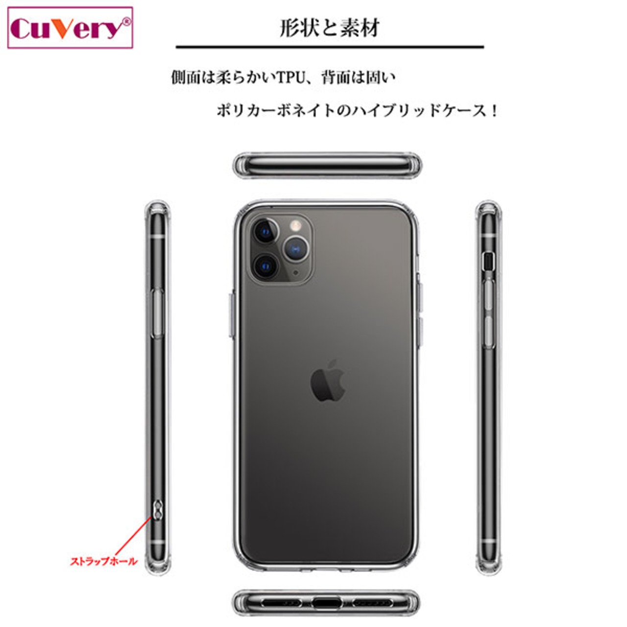 ケース本体:素材・成分:TPU、ソフト素材(側面)とポリカーボネイト、ハード素材(背面)を使用した最新のハイブリッドケース